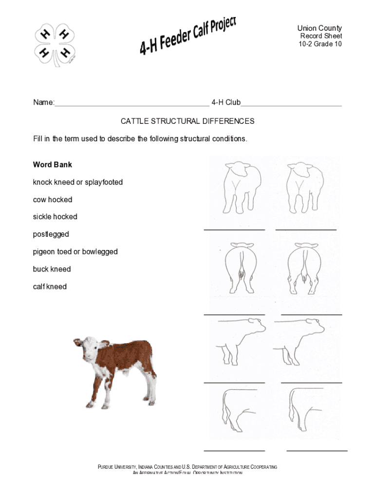 Union County Record Sheet 102 Grade 10Name:4H Club CATTLE STRUCTURAL DIFFERENCESFill in the term used to describe the following structural conditions. Word Bank knock kneed or splayfooted cow hocked