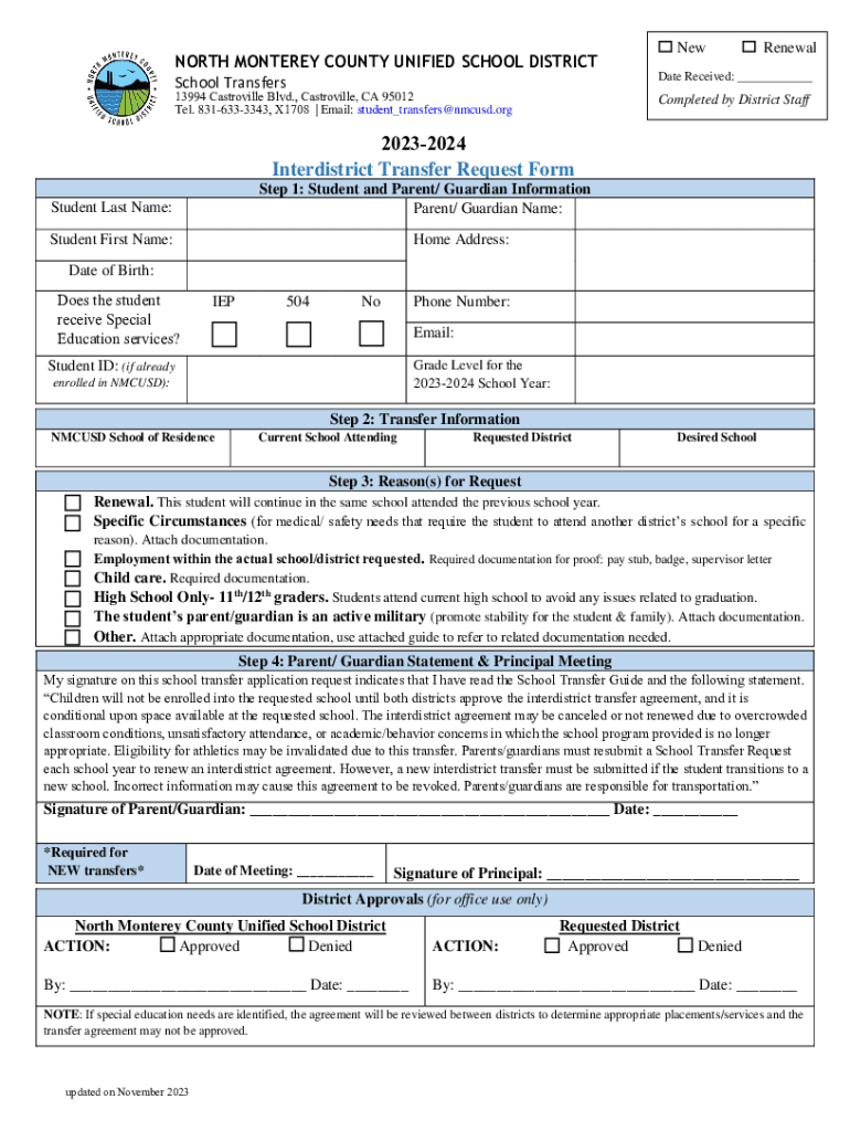NORTH MONTEREY COUNTY UNIFIED SCHOOL DISTRICT School Transfers13994 Castroville Blvd., Castroville, CA 95012 Tel. 8316333343, X1708 | Email: student_transfers@nmcusd.orgNewRenewalDate Received: ___Completed