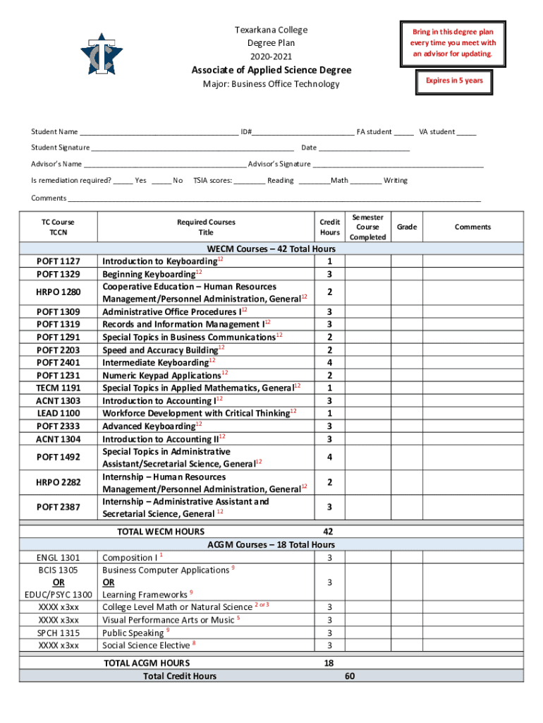 Texarkana College Degree Plan 20202021Bring in this degree plan every time you meet with an advisor for updating.Major: Business Office TechnologyExpires in 5 yearsAssociate of Applied Science DegreeStudent