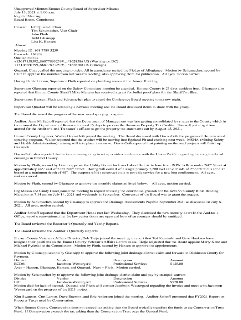 Unapproved Minutes Emmet County Board of Supervisor Minutes July 13, 2021 at 9:00 a.m. Regular Meeting Board Room, Courthouse Present:Jeff Quastad, Chair Tim Schumacher, ViceChair John Pluth Todd