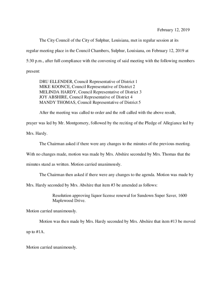 Get the free February 12, 2019 The City Council of the City of Sulphur ...