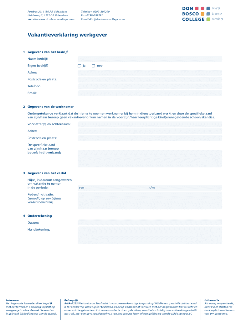 Postbus 23, 1130 AA Volendam Heideweg 2, 1132 DB Volendam Website www.donboscocollege.comTelefoon 0299399299 Fax 0299399291 Email dbc@donboscocollege.comVakantieverklaring werkgever 1Gegevens van