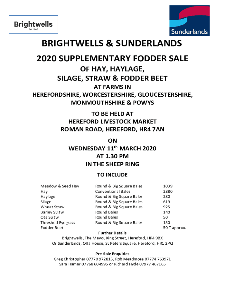 BRIGHTWELLS & SUNDERLANDS 2020 SUPPLEMENTARY FODDER SALE OF HAY, HAYLAGE, SILAGE, STRAW & FODDER BEET AT FARMS IN HEREFORDSHIRE, WORCESTERSHIRE, GLOUCESTERSHIRE, MONMOUTHSHIRE & POWYS TO BE HELD AT