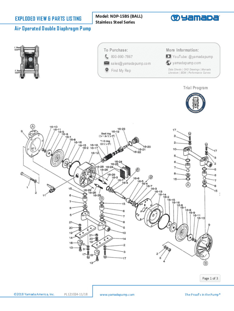 EXPLODED VIEW & P ARTS LISTINGModel: NDP15BS (BALL) Stainless Steel SeriesAir Operated Double Diaphragm P umpTo Purchase:More Information:8009907867YouTube: @yamadapumpsales@yamadapump.comyamadapump.comFind