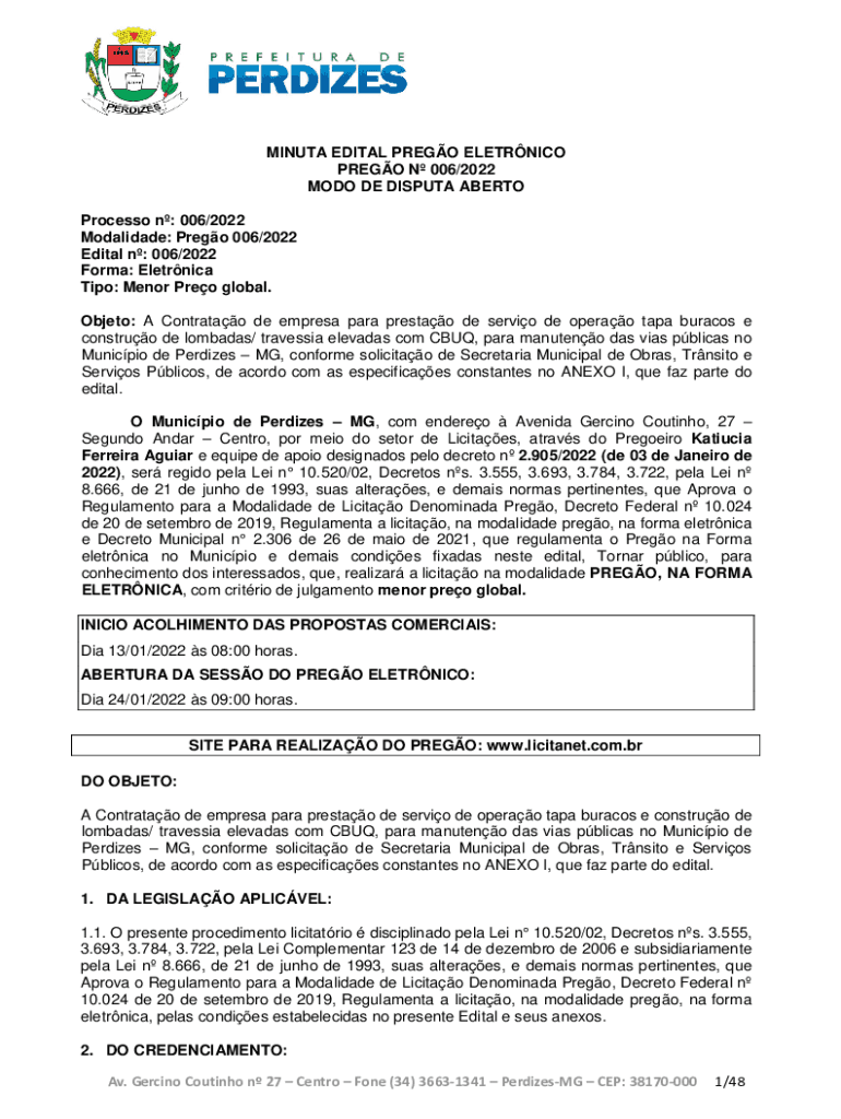 MINUTA EDITAL PREGO ELETRNICO PREGO N 006/2022 MODO DE DISPUTA ABERTO Processo n: 006/2022 Modalidade: Prego 006/2022 Edital n: 006/2022 Forma: Eletrnica Tipo: Menor Preo global. Objeto: A Contratao