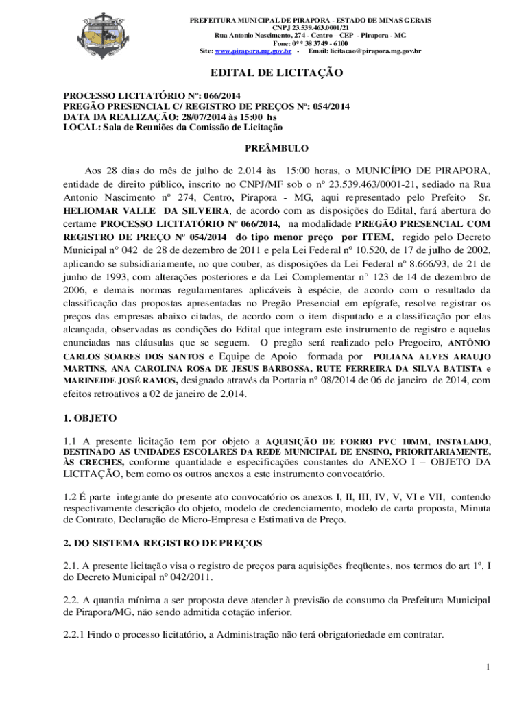 PREFEITURA MUNICIPAL DE PIRAPORA ESTADO DE MINAS GERAIS CNPJ 23.539.463.0001/21 Rua Antonio Nascimento, 274 Centro CEP Pirapora MG Fone: 0** 38 3749 6100 Site: www.pirapora.mg.gov.br Email: licitacao@pirapora.mg.gov.brEDITAL
