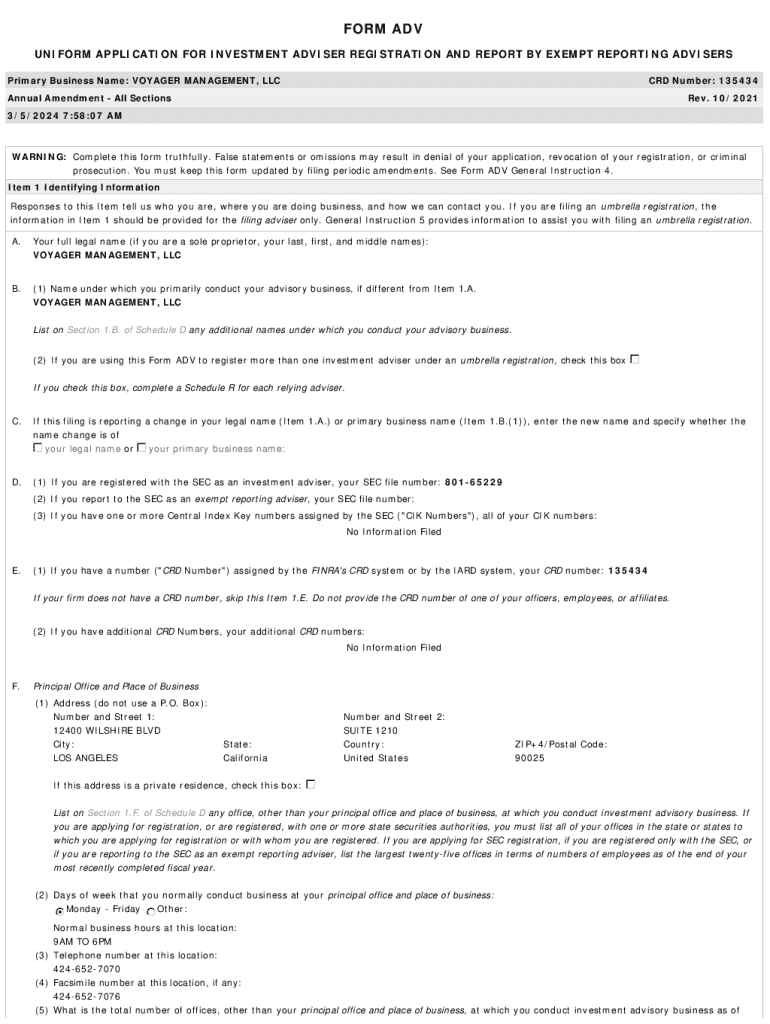 FORM ADV UNIFORM APPLICATION FOR INVESTMENT ADVISER REGISTRATION AND REPORT BY EXEMPT REPORTING ADVISERS Primary Business Name: VOYAGER MANAGEMENT, LLCCRD Number: 135434Annual Amendment All SectionsRev.