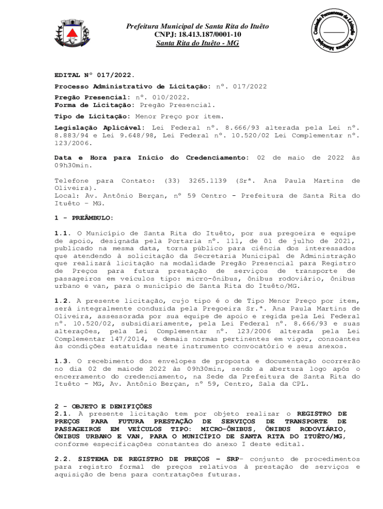 Prefeitura Municipal de Santa Rita do Ituto CNPJ: 18.413.187/000110 Santa Rita do Ituto MGEDITAL N 017/2022. Processo Administrativo de Licitao: n. 017/2022 Prego Presencial: n. 010/2022. Forma de