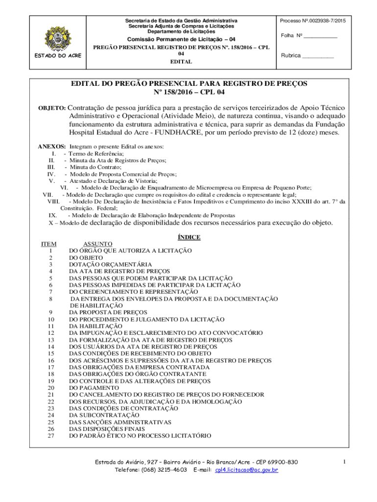 Secretaria de Estado da Gesto Administrativa Secretaria Adjunta de Compras e Licitaes Departamento de LicitaesComisso Permanente de Licitao 04 ESTADO DO ACREPREGO PRESENCIAL REGISTRO DE PREOS N. 158/2016