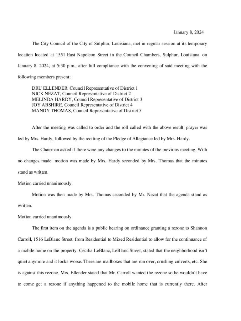 January 8, 2024 The City Council of the City of Sulphur, Louisiana, met in regular session at its temporary location located at 1551 East Napoleon Street in the Council Chambers, Sulphur, Louisiana,