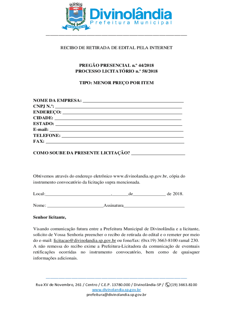 ___RECIBO DE RETIRADA DE EDITAL PELA INTERNETPREGO PRESENCIAL n. 44/2018 PROCESSO LICITATRIO n. 58/2018 TIPO: MENOR PREO POR ITEMNOME DA EMPRESA: ___ CNPJ N.: ___ ENDEREO: ___ CIDADE: ___ ESTADO: