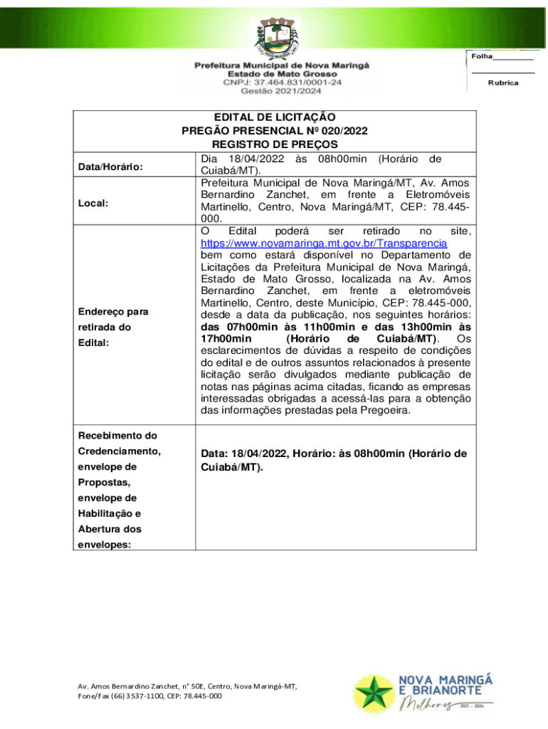 Data/Horrio:Local:Endereo para retirada do Edital:EDITAL DE LICITAO PREGO PRESENCIAL N 020/2022 REGISTRO DE PREOS Dia 18/04/2022 s 08h00min (Horrio de Cuiab/MT). Prefeitura Municipal de Nova Maring/MT,