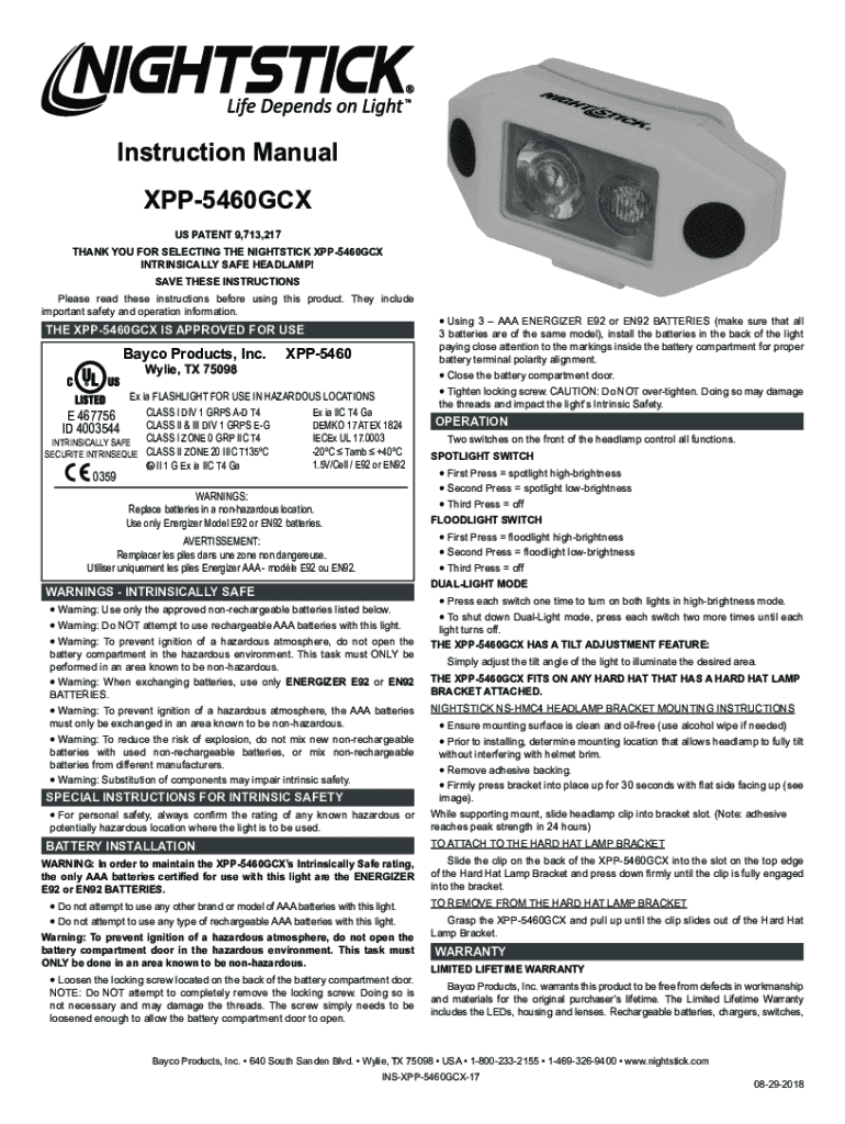 Instruction Manual XPP5460GCX US PATENT 9,713,217 THANK YOU FOR SELECTING THE NIGHTSTICK XPP5460GCX INTRINSICALLY SAFE HEADLAMP! SAVE THESE INSTRUCTIONS Please read these instructions before using