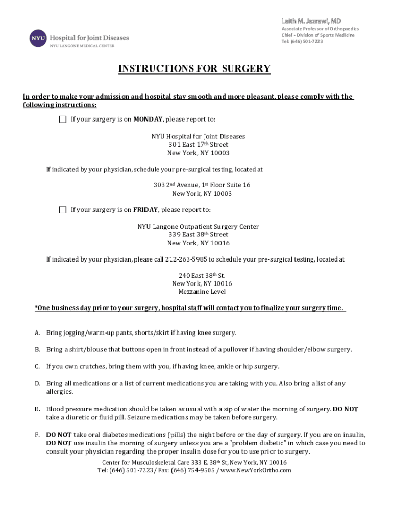 Associate Professor of Orthopaedics Chief Division of Sports MedicineTel: (646) 5017223INSTRUCTIONS FOR SURGERY In order to make your admission and hospital stay smooth and more pleasant, please comply