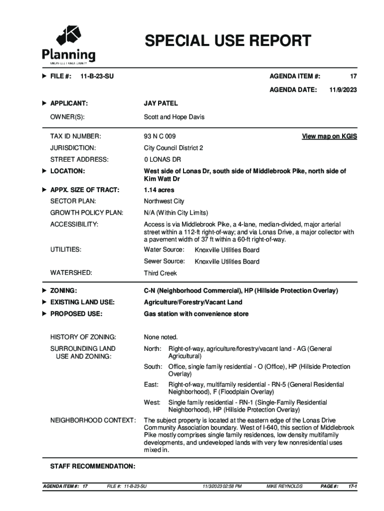 SPECIAL USE REPORT FILE #:AGENDA ITEM #:11B23SU17AGENDA DATE:11/9/2023APPLICANT:JAY PATELOWNER(S):Scott and Hope DavisTAX ID NUMBER:93 N C 009JURISDICTION:City Council District 2STREET ADDRESS:0 LONAS