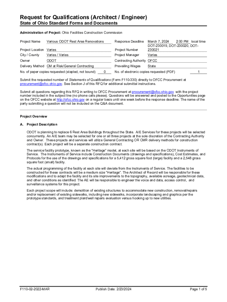 Request for Qualifications (Architect / Engineer) State of Ohio Standard Forms and DocumentsAdministration of Project: Ohio Facilities Construction Commission Project NameVarious ODOT Rest Area RenovationsProject