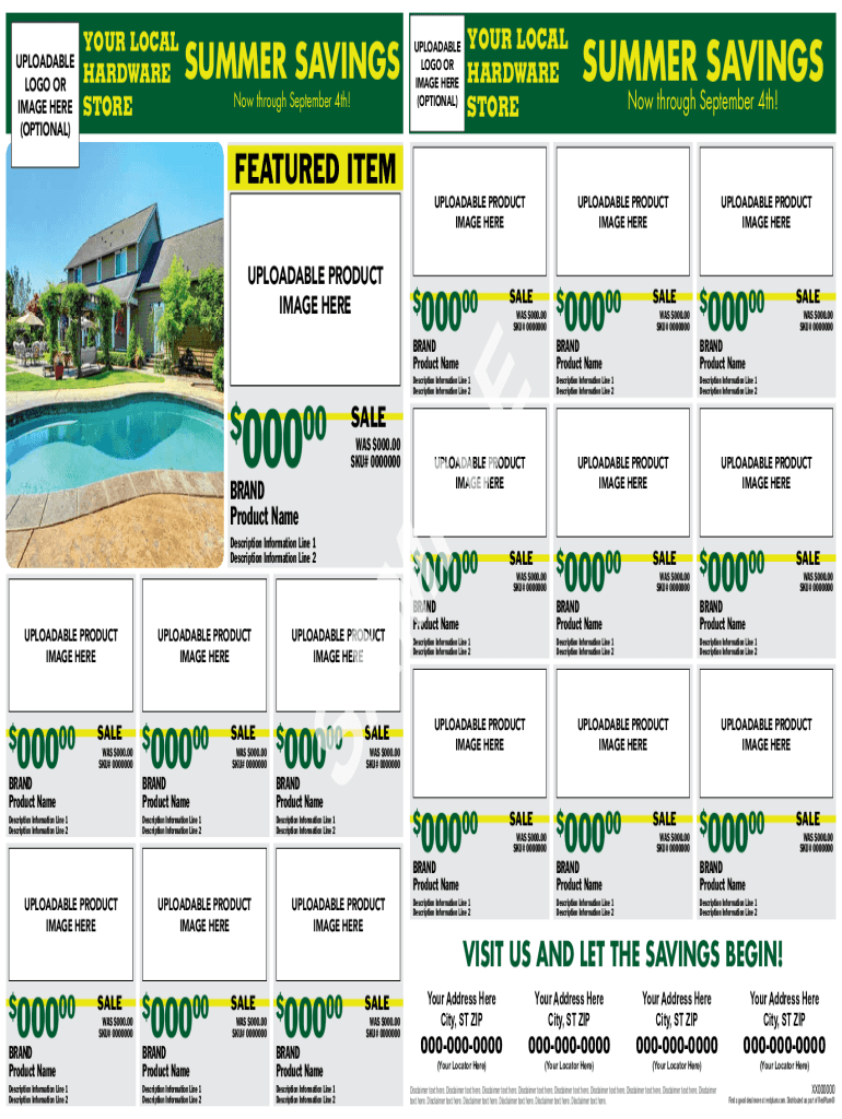 UPLOADABLE LOGO OR IMAGE HERE (OPTIONAL)YOUR LOCAL HARDWARE STORESUMMER SAVINGS Now through September 4th!Featured Item0000000SALE WAS $000.00 SKU# 0000000000$00BRAND Product NameBRAND Product NameDescription