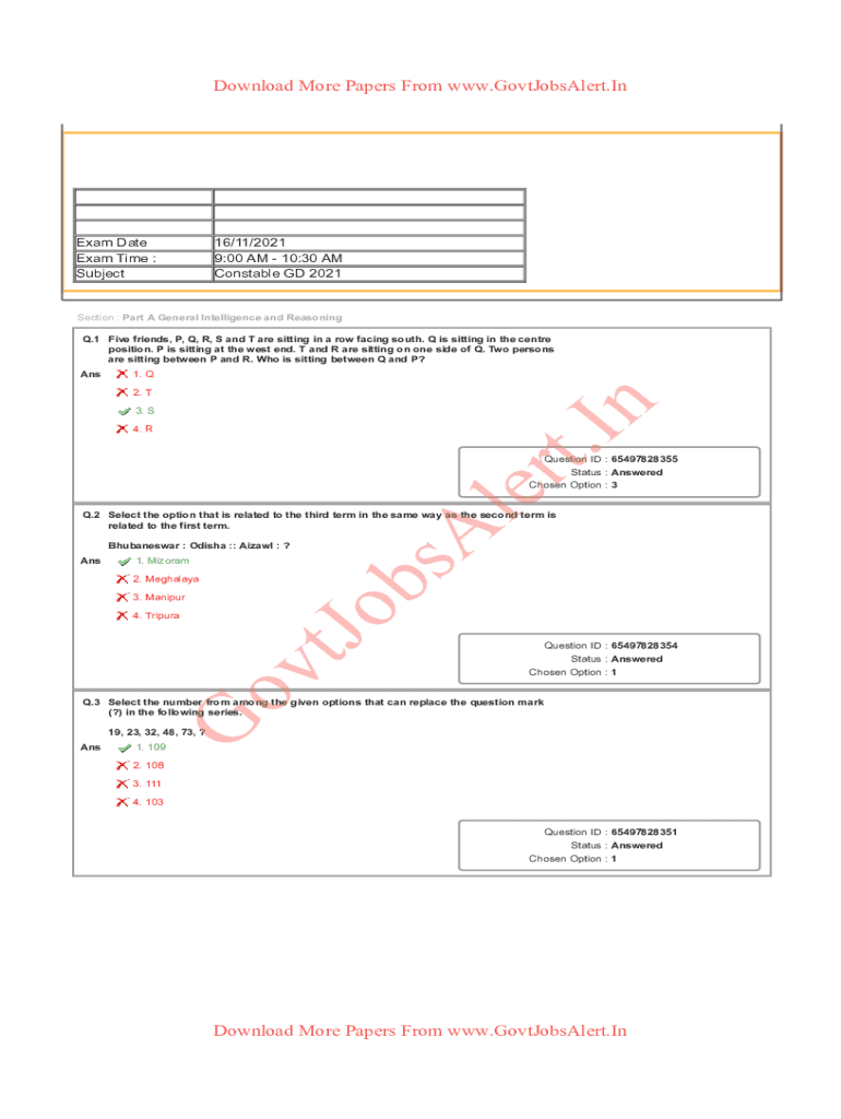 Download More Papers From www.GovtJobsAlert.InExam Date Exam Time : Subject16/11/2021 9:00 AM 10:30 AM Constable GD 2021Section : Part A General Intelligence and Reasoning Q.1 Five friends, P, Q,