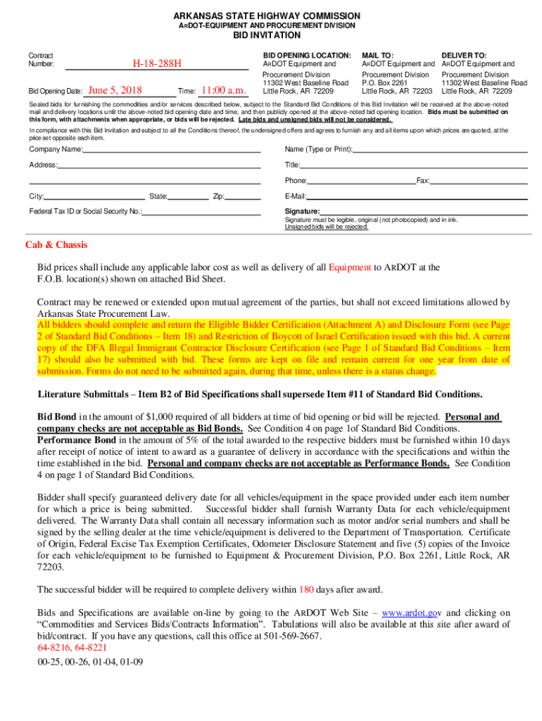 ARKANSAS STATE HIGHWAY COMMISSION ARDOTEQUIPMENT AND PROCUREMENT DIVISIONBID INVITATION Contract Number:Bid Opening Date:H18288H June 5, 2018Time:11:00 a.m.BID OPENING LOCATION: ARDOT Equipment and