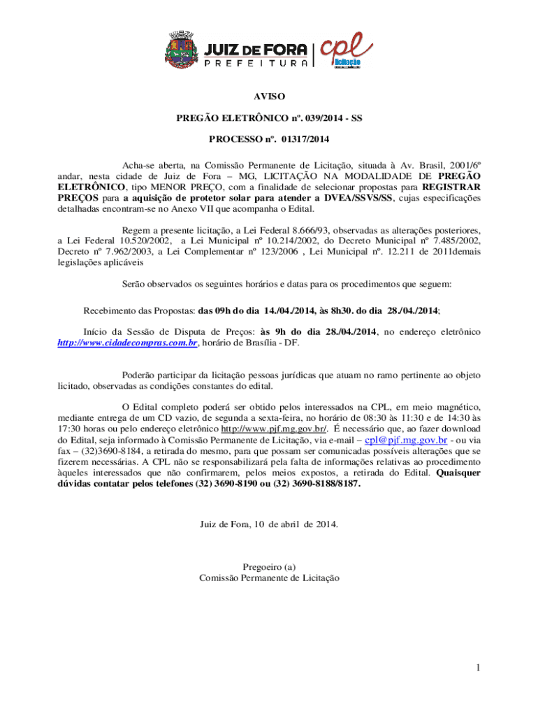 AVISO PREGO ELETRNICO n. 039/2014 SS PROCESSO n. 01317/2014 Achase aberta, na Comisso Permanente de Licitao, situada Av. Brasil, 2001/6 andar, nesta cidade de Juiz de Fora MG, LICITAO NA MODALIDADE