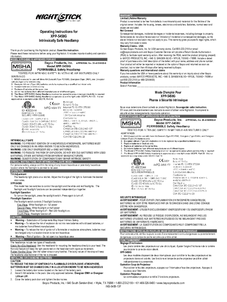 Operating Instructions for XPP5458G Intrinsically Safe Headlamp Thank you for purchasing this Nightstick product. Save this instruction. Please read these instructions before using your Nightstick.