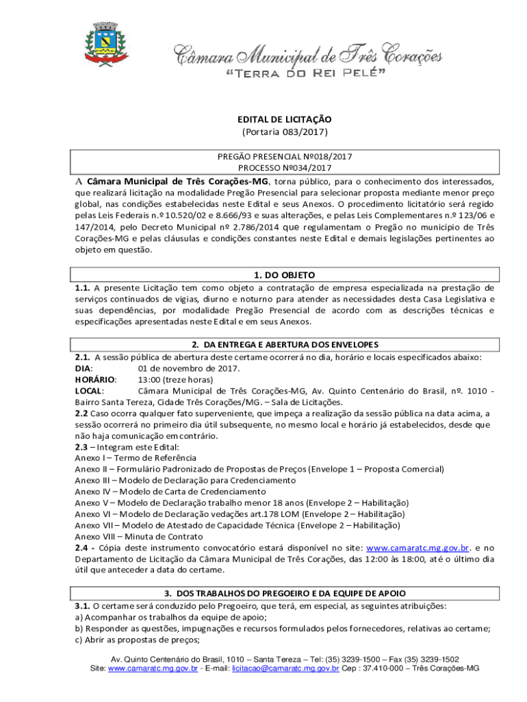 EDITAL DE LICITAO (Portaria 083/2017) PREGO PRESENCIAL N018/2017 PROCESSO N034/2017 A Cmara Municipal de Trs CoraesMG, torna pblico, para o conhecimento dos interessados, que realizar licitao na modalidade