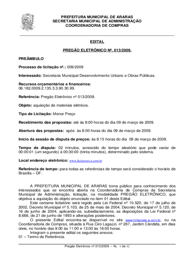 PREFEITURA MUNICIPAL DE ARARAS SECRETARIA MUNICIPAL DE ADMINISTRAO COORDENADORIA DE COMPRAS ___ EDITAL PREGO ELETRNICO N. 013/2009. PREMBULO Processo de licitao n.: 009/2009 Interessado: Secretaria