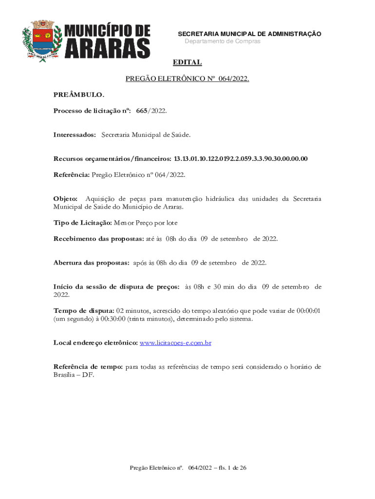 SECRETARIA MUNICIPAL DE ADMINISTRAO Departamento de ComprasEDITAL PREGO ELETRNICO N 064/2022. PREMBULO. Processo de licitao n: 665/2022. Interessados: Secretaria Municipal de Sade. Recursos oramentrios/financeiros: