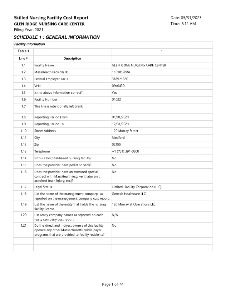Skilled Nursing Facility Cost ReportDate: 05/31/2023 Time: 8:11 AMGLEN RIDGE NURSING CARE CENTER Filing Year: 2021SCHEDULE 1 : GENERAL INFORMATION Facility Information Table 11Line #Description1.1Facility
