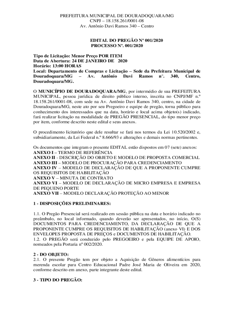 PREFEITURA MUNICIPAL DE DOURADOQUARA/MG CNPJ 18.158.261/000108 Av. Antnio Davi Ramos 340 Centro EDITAL DO PREGO N 001/2020 PROCESSO N. 001/2020 Tipo de Licitao: Menor Preo POR ITEM Data de Abertura: