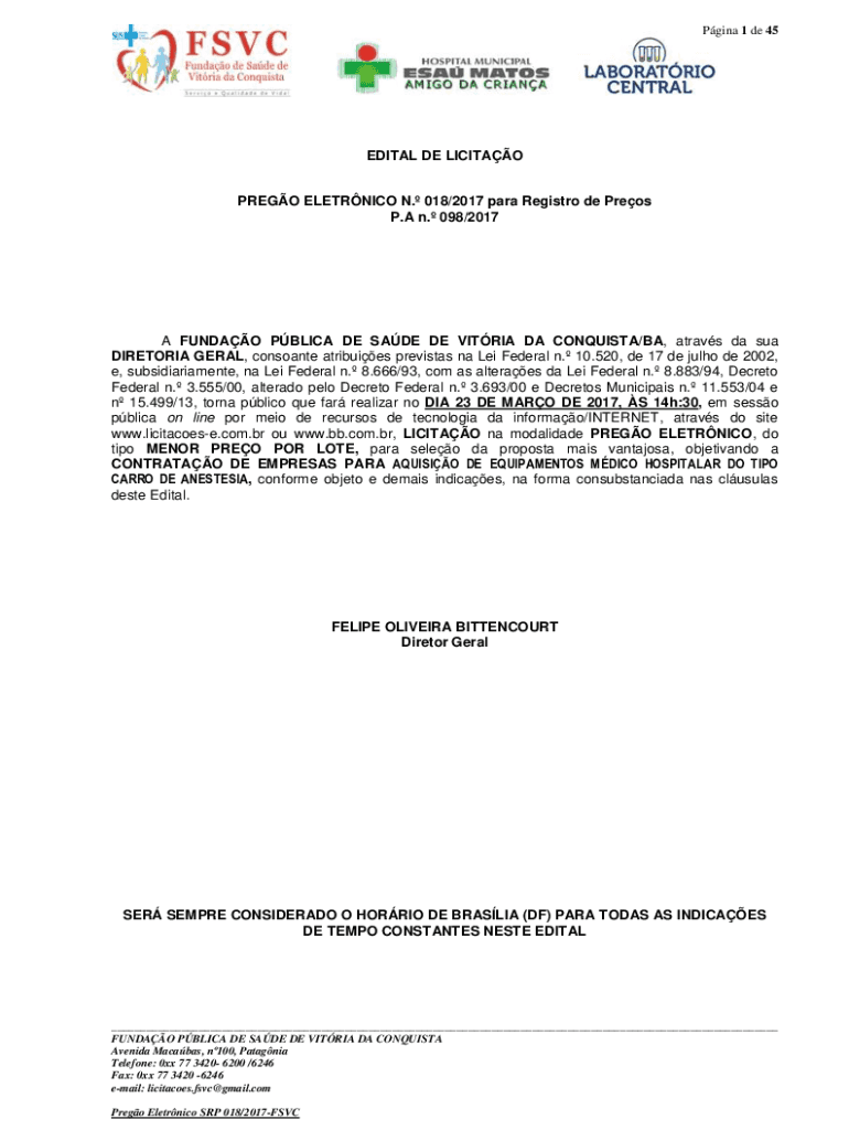 Pgina 1 de 45EDITAL DE LICITAOPREGO ELETRNICO N. 018/2017 para Registro de Preos P.A n. 098/2017A FUNDAO PBLICA DE SADE DE VITRIA DA CONQUISTA/BA, atravs da sua DIRETORIA GERAL, consoante atribuies