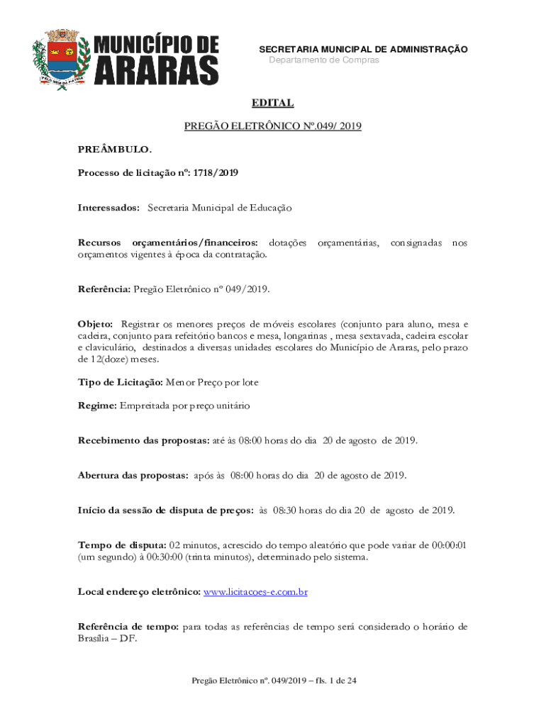 SECRETARIA MUNICIPAL DE ADMINISTRAO Departamento de ComprasEDITAL PREGO ELETRNICO N.049/ 2019 PREMBULO. Processo de licitao n: 1718/2019 Interessados: Secretaria Municipal de Educao Recursos oramentrios/financeiros:
