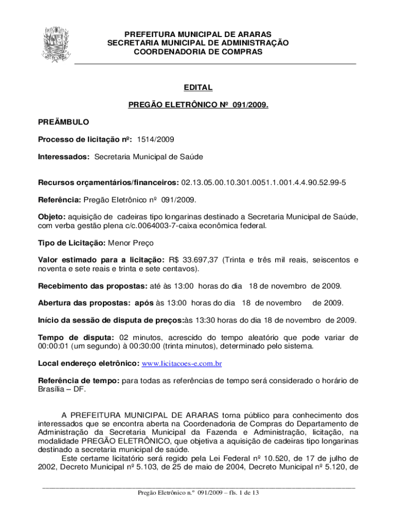 PREFEITURA MUNICIPAL DE ARARAS SECRETARIA MUNICIPAL DE ADMINISTRAO COORDENADORIA DE COMPRAS ___EDITAL PREGO ELETRNICO N 091/2009. PREMBULO Processo de licitao n: 1514/2009 Interessados: Secretaria