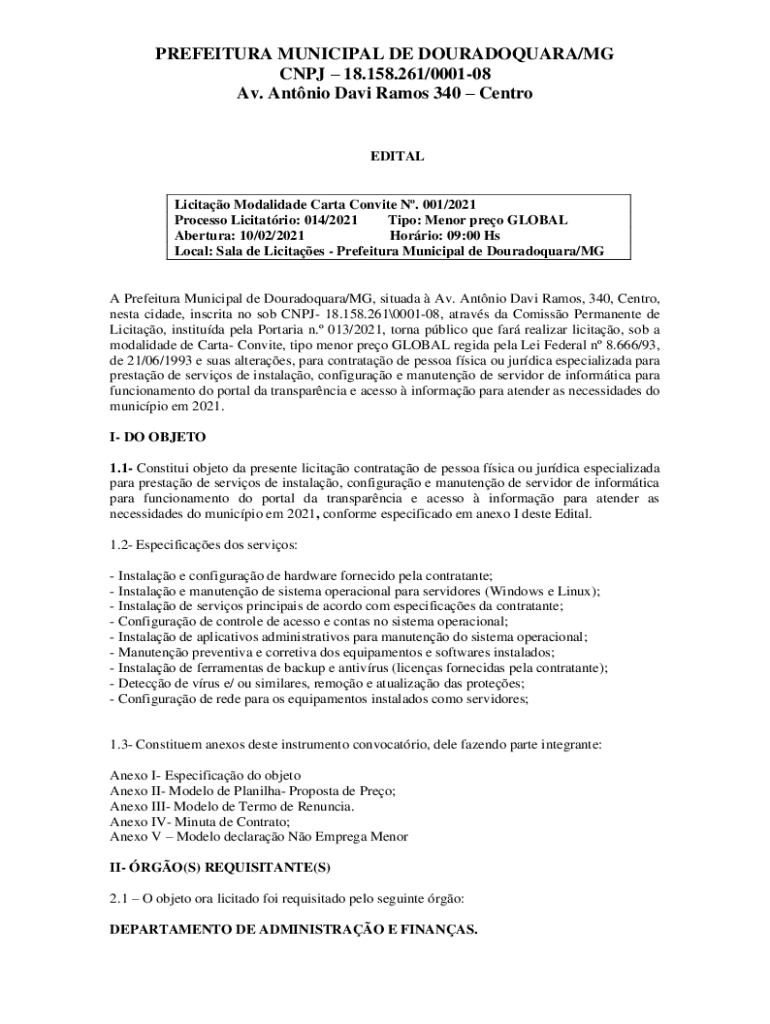 PREFEITURA MUNICIPAL DE DOURADOQUARA/MG CNPJ 18.158.261/000108 Av. Antnio Davi Ramos 340 CentroEDITALLicitao Modalidade Carta Convite N. 001/2021 Processo Licitatrio: 014/2021 Tipo: Menor preo GLOBAL