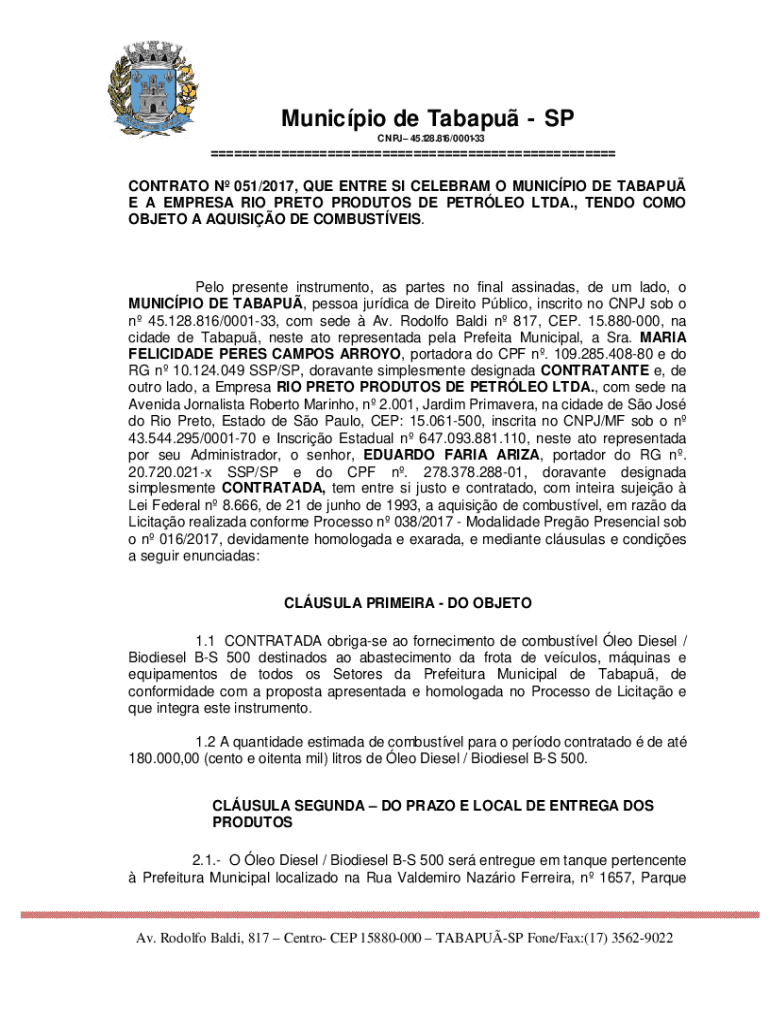 Municpio de Tabapu SP CNPJ 45.128.816/000133 CONTRATO N 051/2017, QUE ENTRE SI CELEBRAM O MUNICPIO DE TABAPU E A EMPRESA RIO PRETO PRODUTOS DE PETRLEO LTDA., TENDO COMO OBJETO A AQUISIO DE COMBUSTVEIS.Pelo