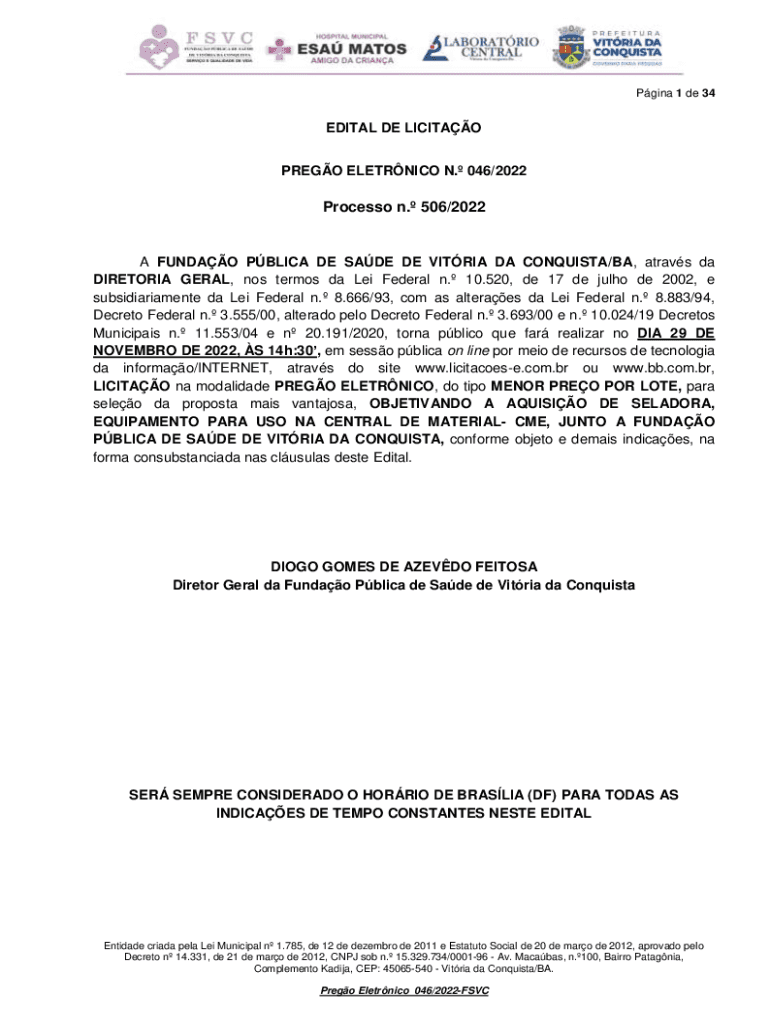 Pgina 1 de 34EDITAL DE LICITAO PREGO ELETRNICO N. 046/2022Processo n. 506/2022A FUNDAO PBLICA DE SADE DE VITRIA DA CONQUISTA/BA, atravs da DIRETORIA GERAL, nos termos da Lei Federal n. 10.520, de