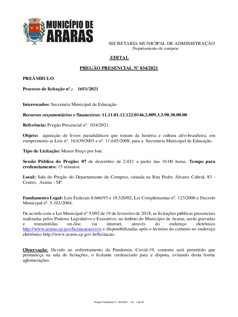 SECRETARIA MUNICIPAL DE ADMINISTRAO Departamento de comprasEDITAL PREGO PRESENCIAL N 034/2021 PREMBULO Processo de licitao n.: 1651/2021Interessados: Secretaria Municipal de Educao Recursos oramentrios