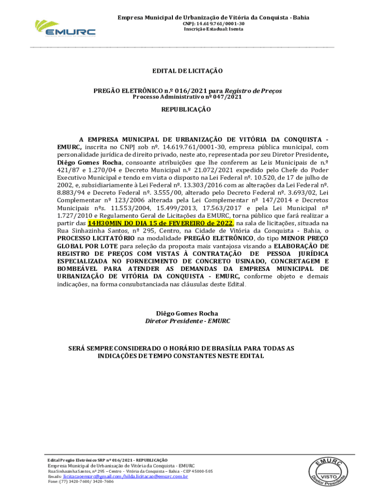 Empresa Municipal de Urbanizao de Vitria da Conquista Bahia CNPJ: 14.619.761/000130 Inscrio Estadual: Isenta___EDITAL DE LICITAO PREGO ELETRNICO n. 016/2021 para Registro de Preos Processo Administrativo