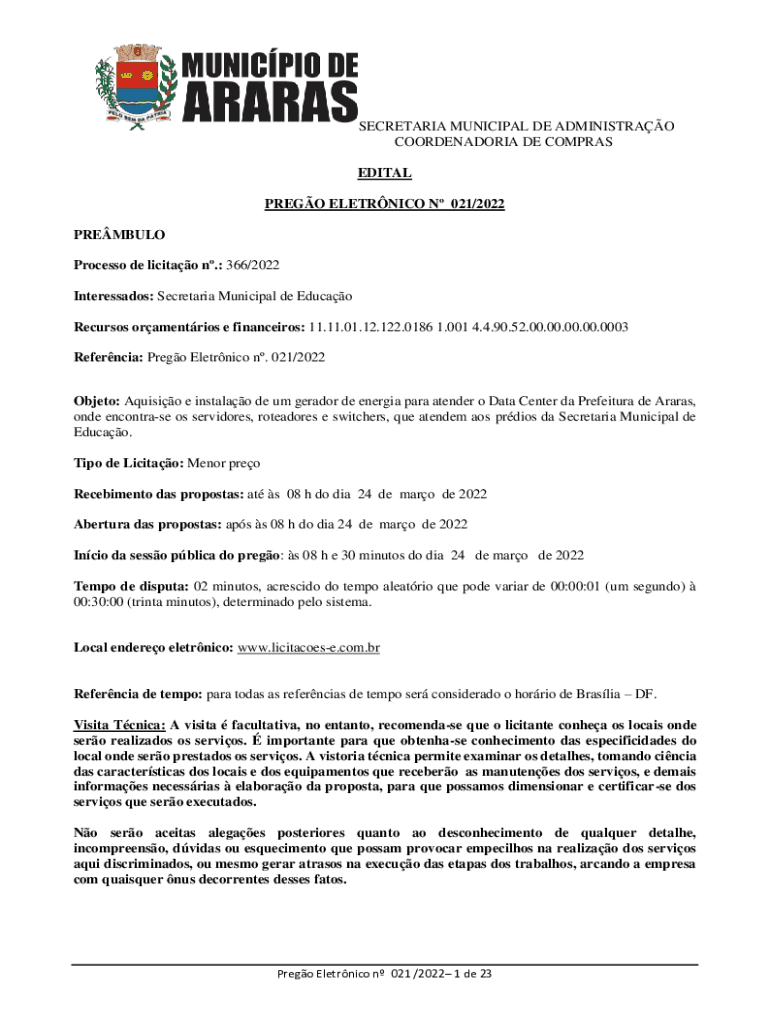 SECRETARIA MUNICIPAL DE ADMINISTRAO COORDENADORIA DE COMPRAS EDITAL PREGO ELETRNICO N 021/2022 PREMBULO Processo de licitao n.: 366/2022 Interessados: Secretaria Municipal de Educao Recursos oramentrios