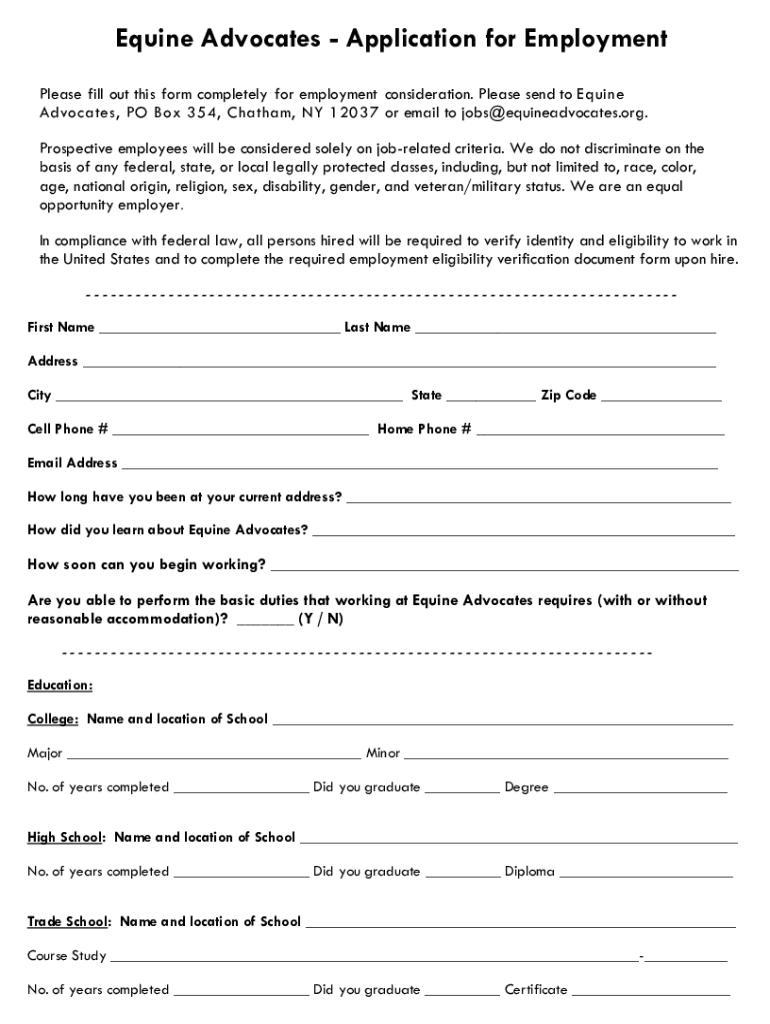 Equine Advocates Application for Employment Please fill out this form completely for employment consideration. Please send to Equine Advocates, PO Box 354, Chatham, NY 12037 or email to jobs@equineadvocates.org.