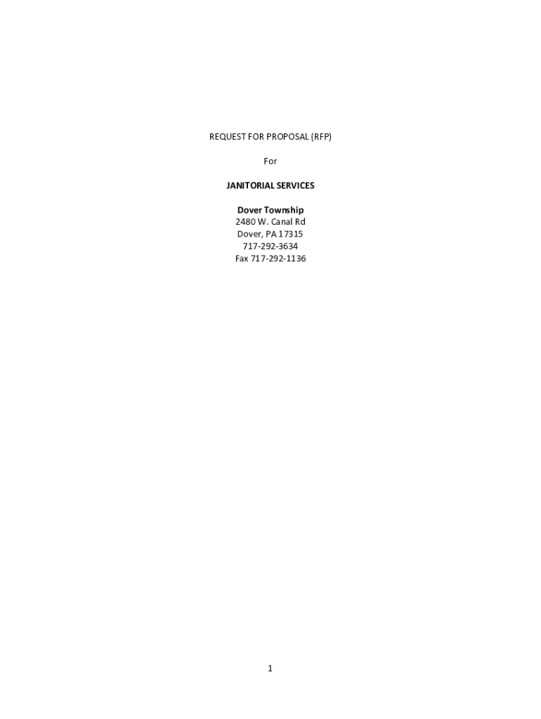REQUEST FOR PROPOSAL (RFP) For JANITORIAL SERVICES Dover Township 2480 W. Canal Rd Dover, PA 17315 7172923634 Fax 71729211361NOTICE Dover Township is accepting proposals for janitorial services. Each