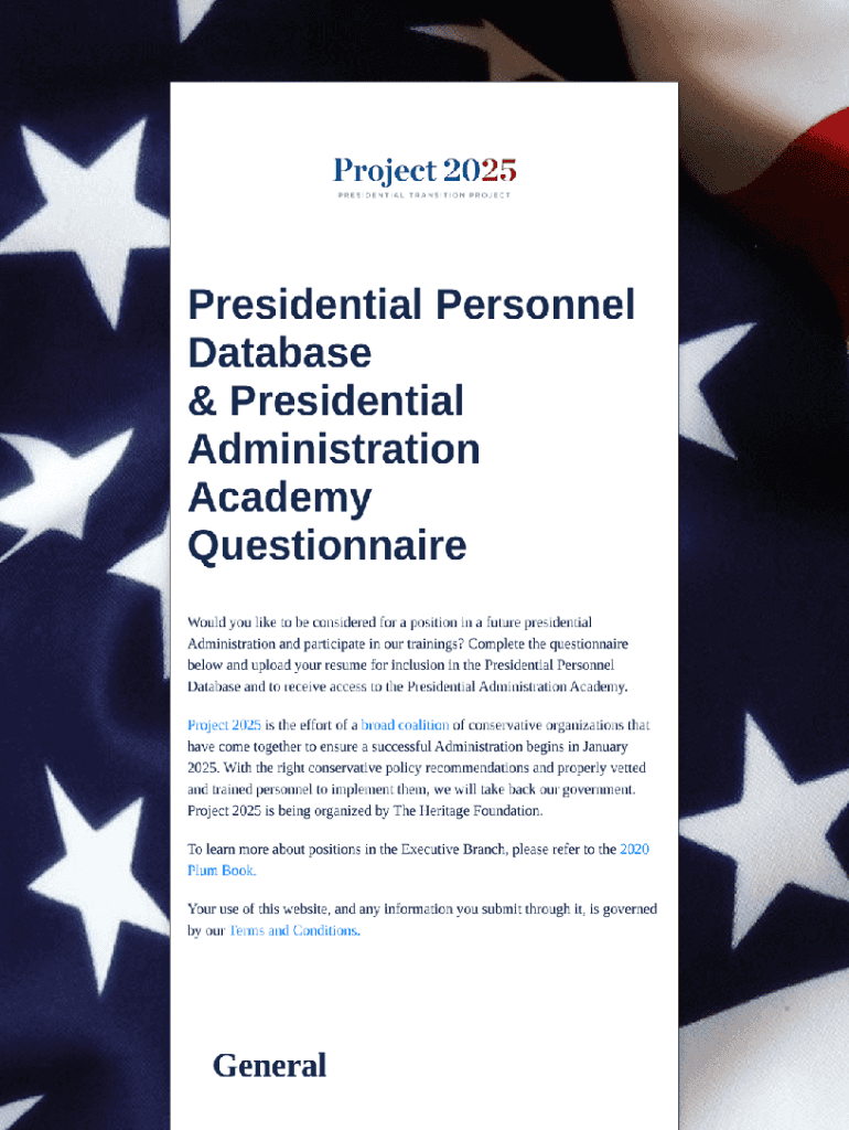 Project 2025 PRESIDENTIALTRANSITIONPROJECTPresidential Personnel Database& Presidential Administration Academy Questionnaire Would you liketo be considered for a position in a future presidential
