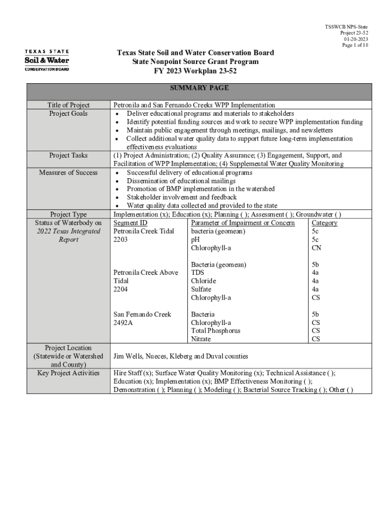 Get the free SUMMARY PAGE Title of Project Petronila and San ... - tsswcb texas