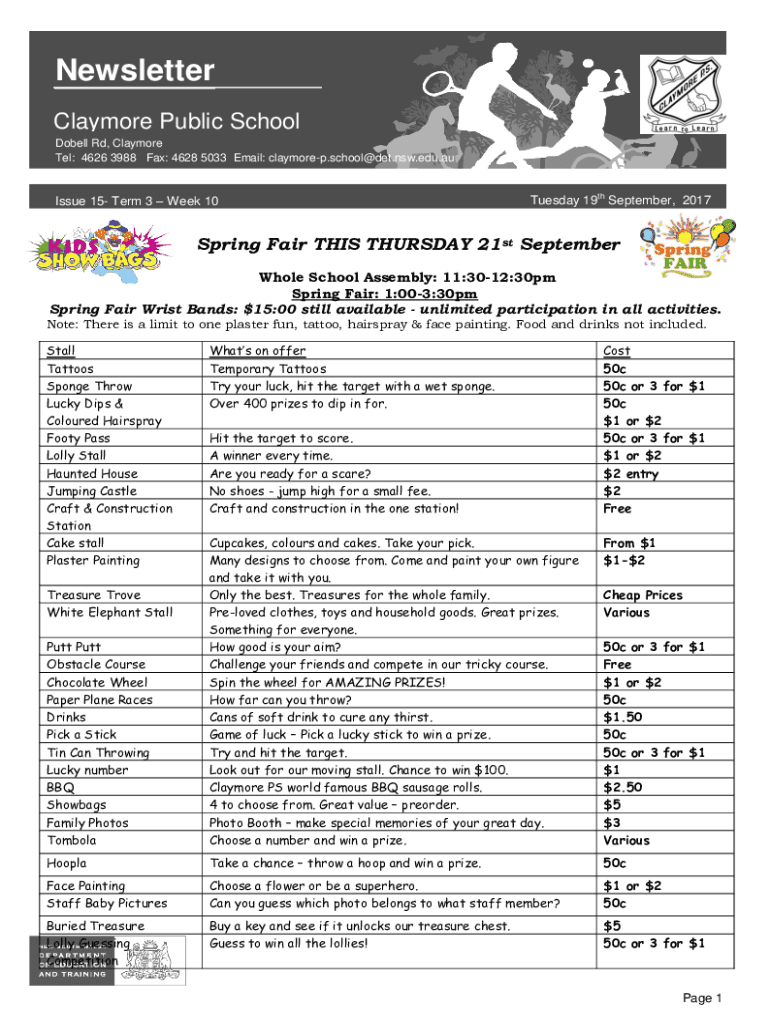 Newsletter Claymore Public School Dobell Rd, Claymore Tel: 4626 3988 Fax: 4628 5033 Email: claymorep.school@det.nsw.edu.auIssue 15 Term 3 Week 10thTuesday 19 September, 2017 2012Spring Fair THIS THURSDAY