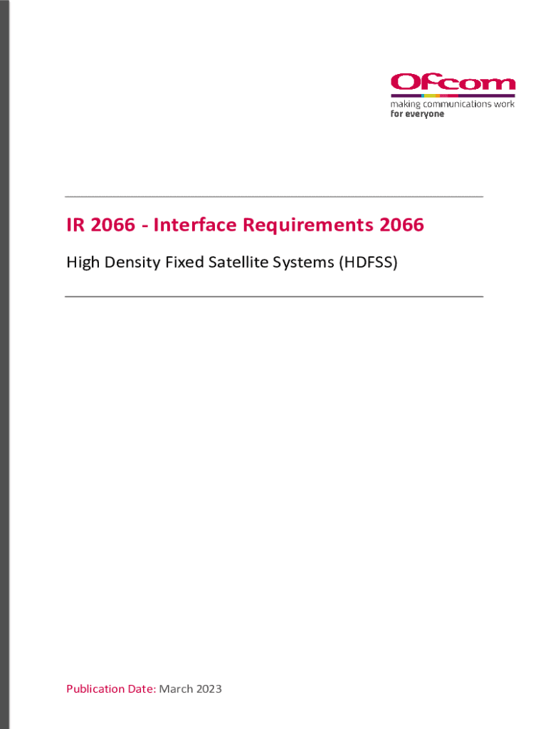 IR 2066 Interface Requirements 2066 High Density Fixed Satellite Systems (HDFSS)Publication Date: March 2023Contents Section 1. Forward12. Minimum equipment requirements for operation within the UK23.