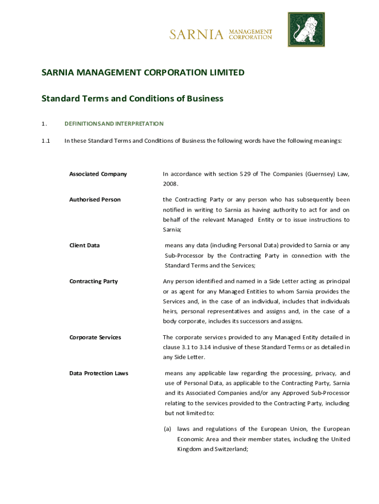 NARNIA MANAGEMENT CORPORATION LIMITED Standard Terms and Conditions of Business 1.DEFINITIONS AND INTERPRETATION1.1In these Standard Terms and Conditions of Business the following words have the following
