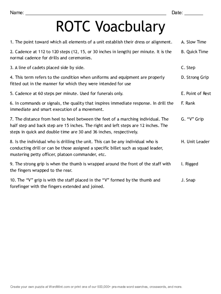 Name: ___ Date: ___ROTC Voacbulary 1. The point toward which all elements of a unit establish their dress or alignment.A. Slow Time2. Cadence at 112 to 120 steps (12, 15, or 30 inches in length) per