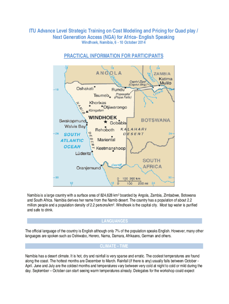 ITU Advance Level Strategic Training on Cost Modeling and Pricing for Quad play / Next Generation Access (NGA) for Africa English-speaking Windhoek, Namibia, 6 10 October 2014PRACTICAL INFORMATION
