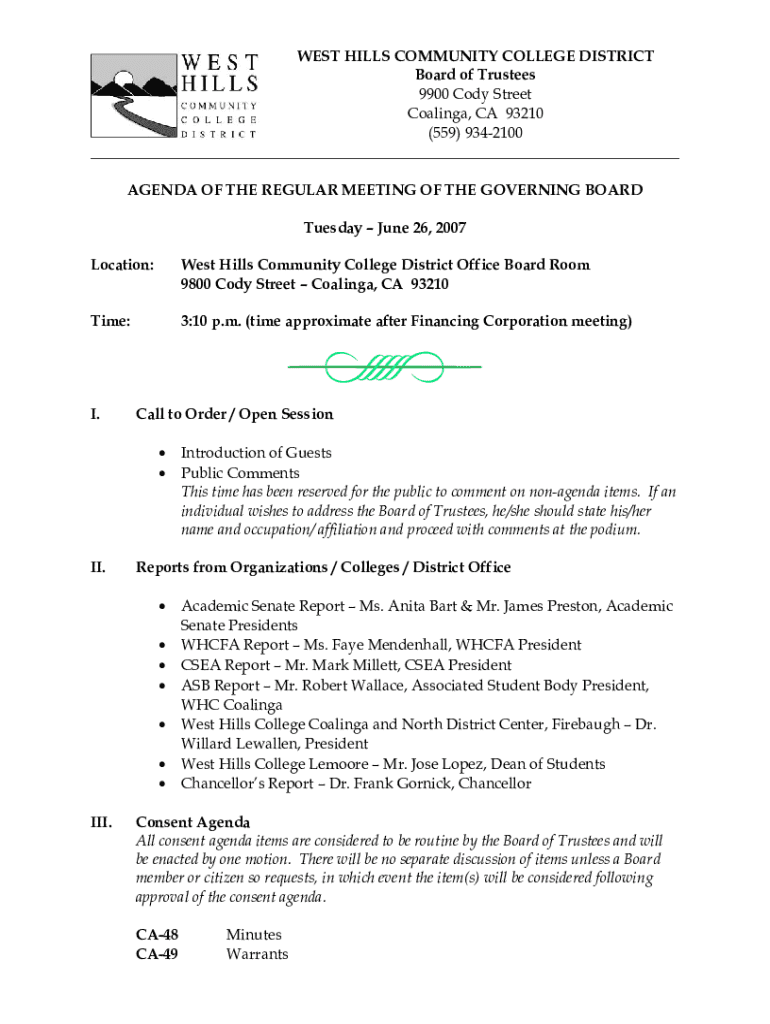 WEST HILLS COMMUNITY COLLEGE DISTRICT Board of Trustees 9900 Cody Street Coalinga, CA 93210 (559) 9342100 ___ AGENDA OF THE REGULAR MEETING OF THE GOVERNING BOARD Tuesday June 26, 2007 Location:West