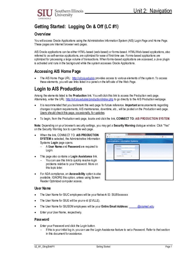 Unit 2: Navigation Getting Started: Logging On & Off (LC #1) Overview You will access Oracle Applications using the Administrative Information System (AIS) Login Page and Home Page. These pages are